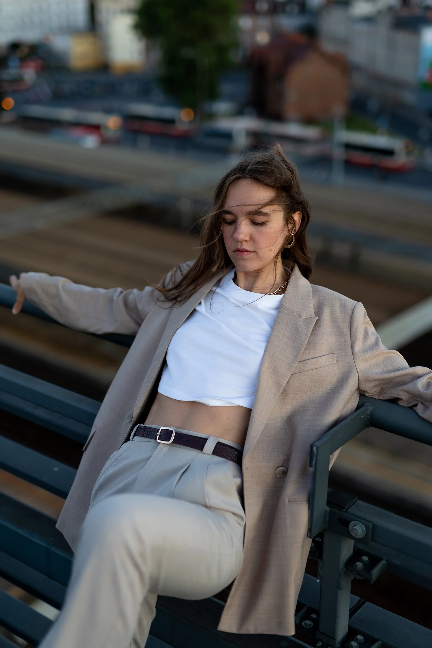 On a rooftop at sunset, the wind dances around the Model, highlighting her elegance as it gently moves through her hair and clothes. The warm glow of the setting sun reflects off the city skyline, creating a serene backdrop. The breeze enhances the model’s graceful presence, capturing a moment of natural beauty and effortless charm.